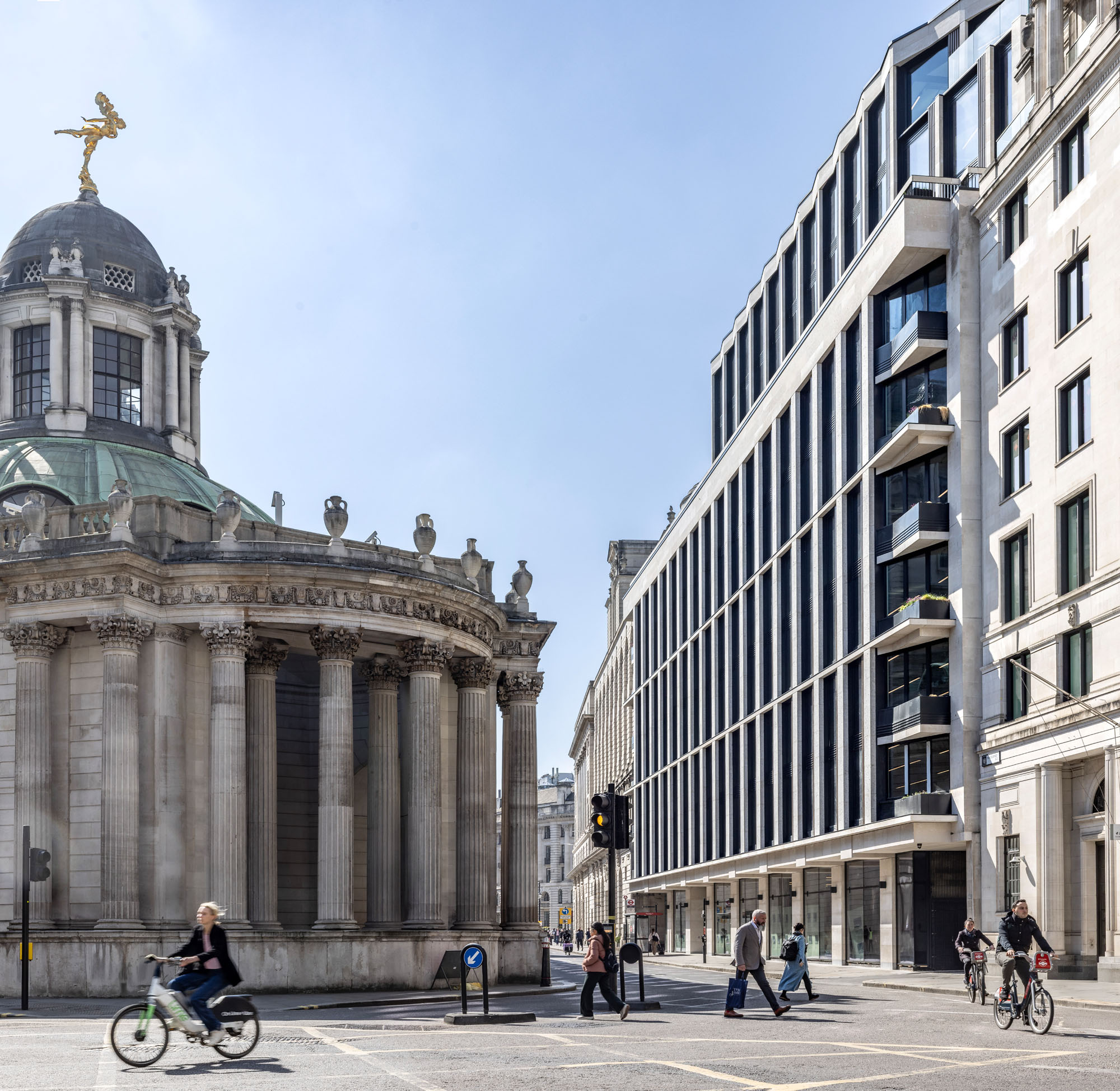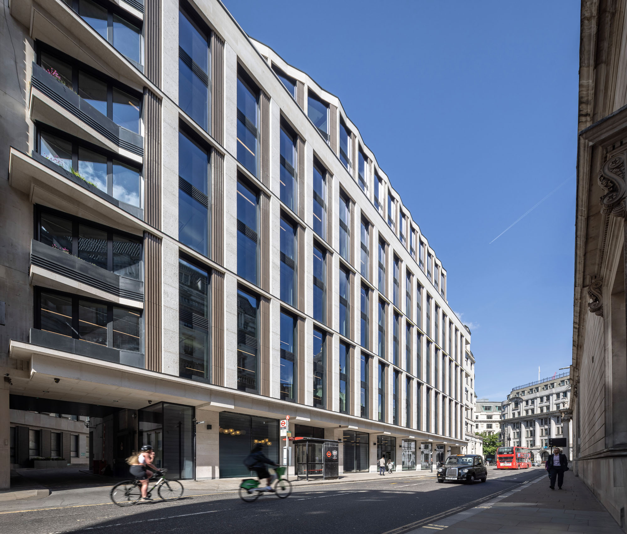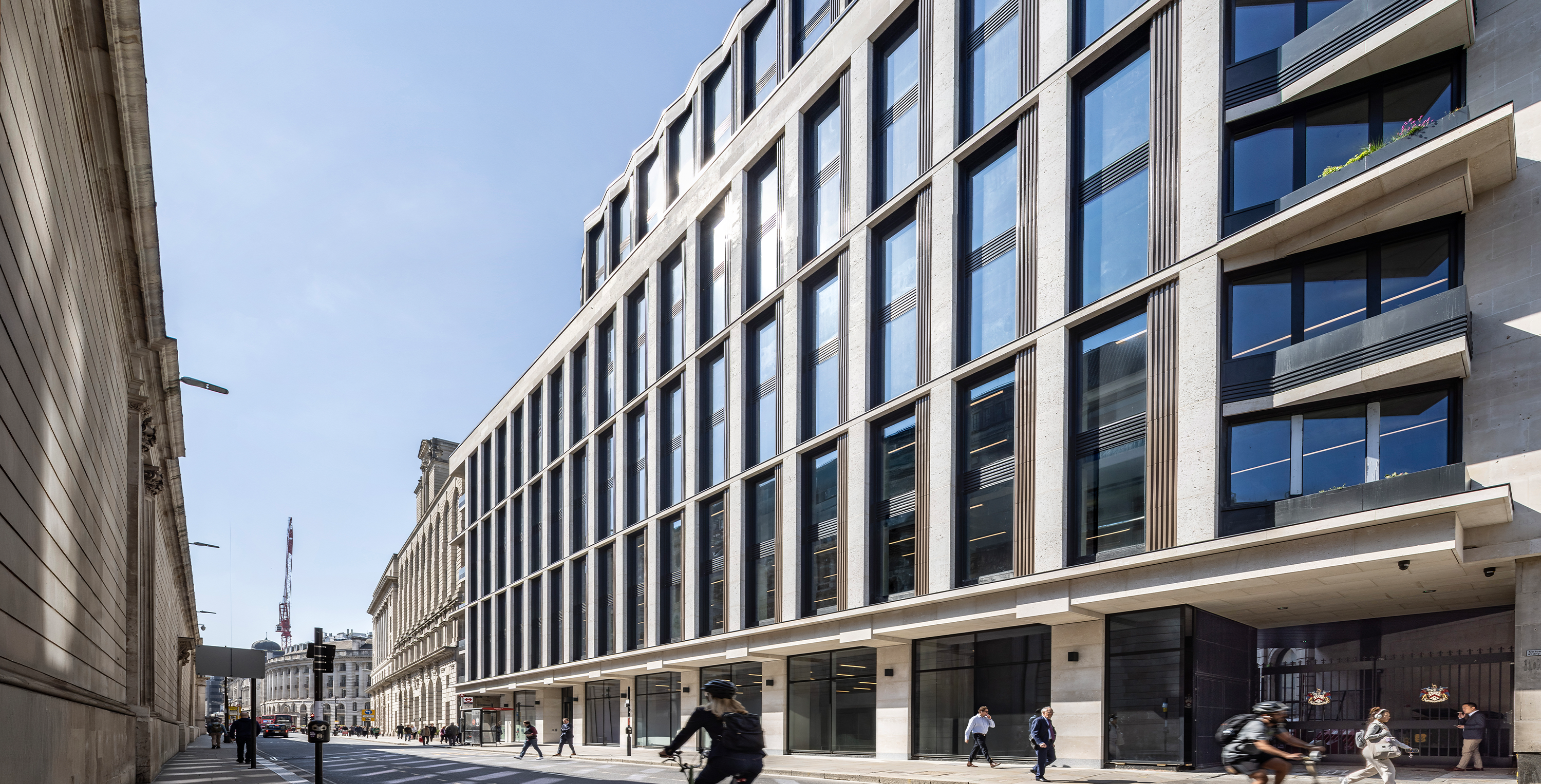 The ‘back to frame’ refurbishment works to the 1960s building at 7 Princes Street, opposite the Bank of England, will include a complete refurbishment and three-storey extension, including remodelling of the central core and complete replacement of the façade. The completed building will provide high quality, contemporary office space with rooftop terraces for private and communal use. The building is located next to The Ned, and with The Grocers Hall to the rear.
