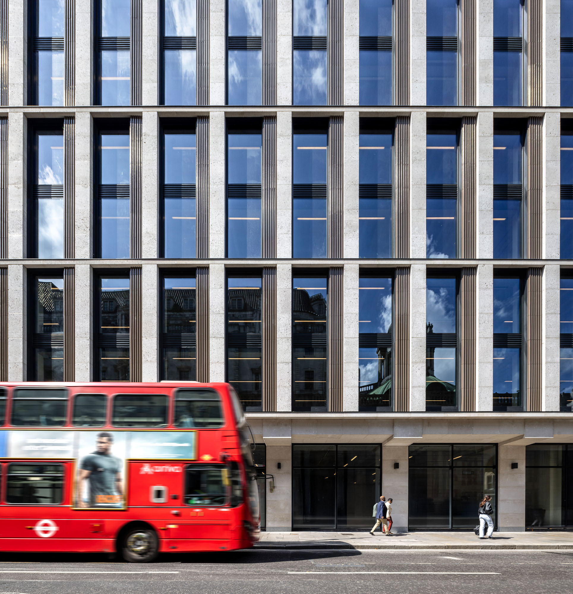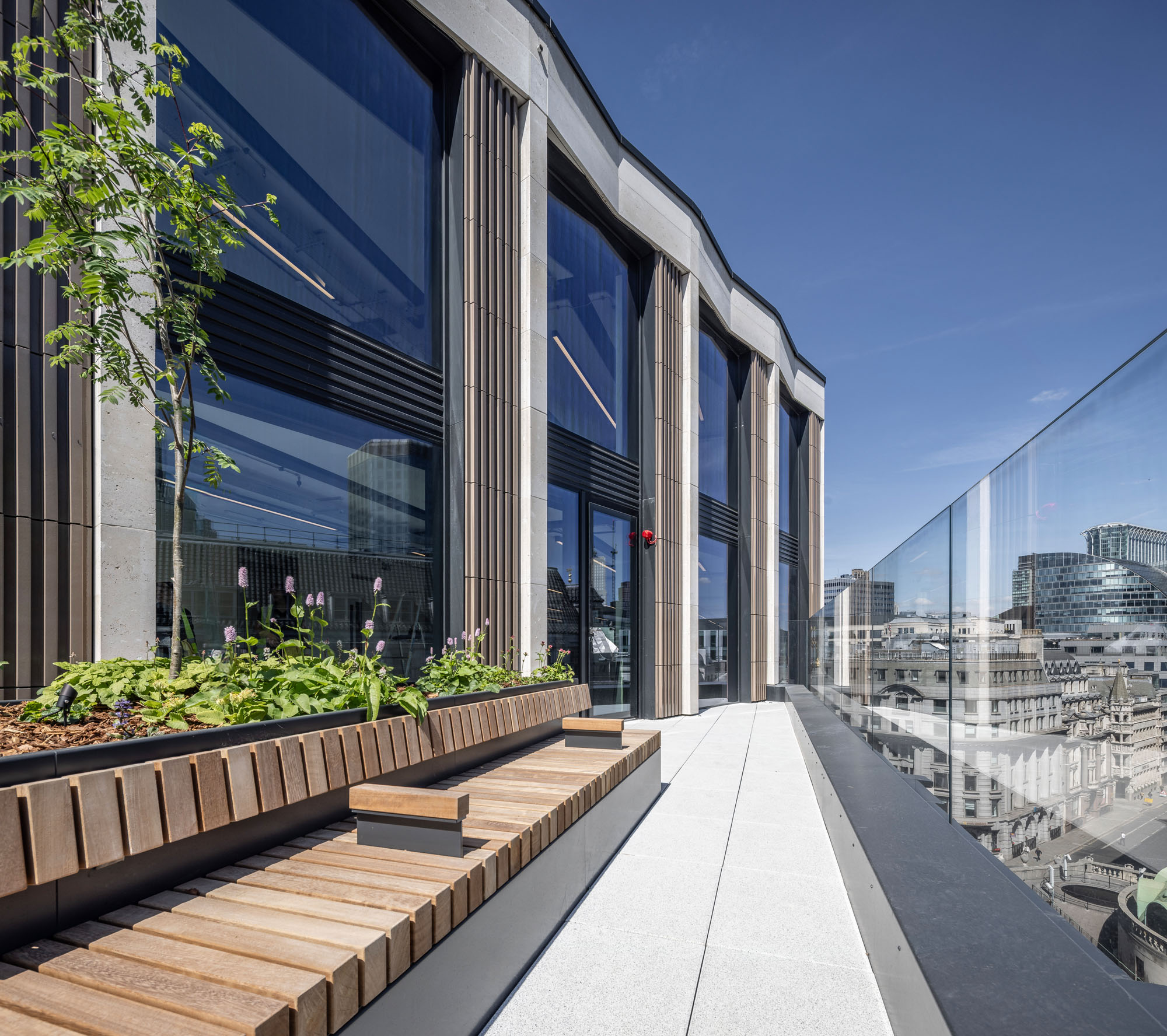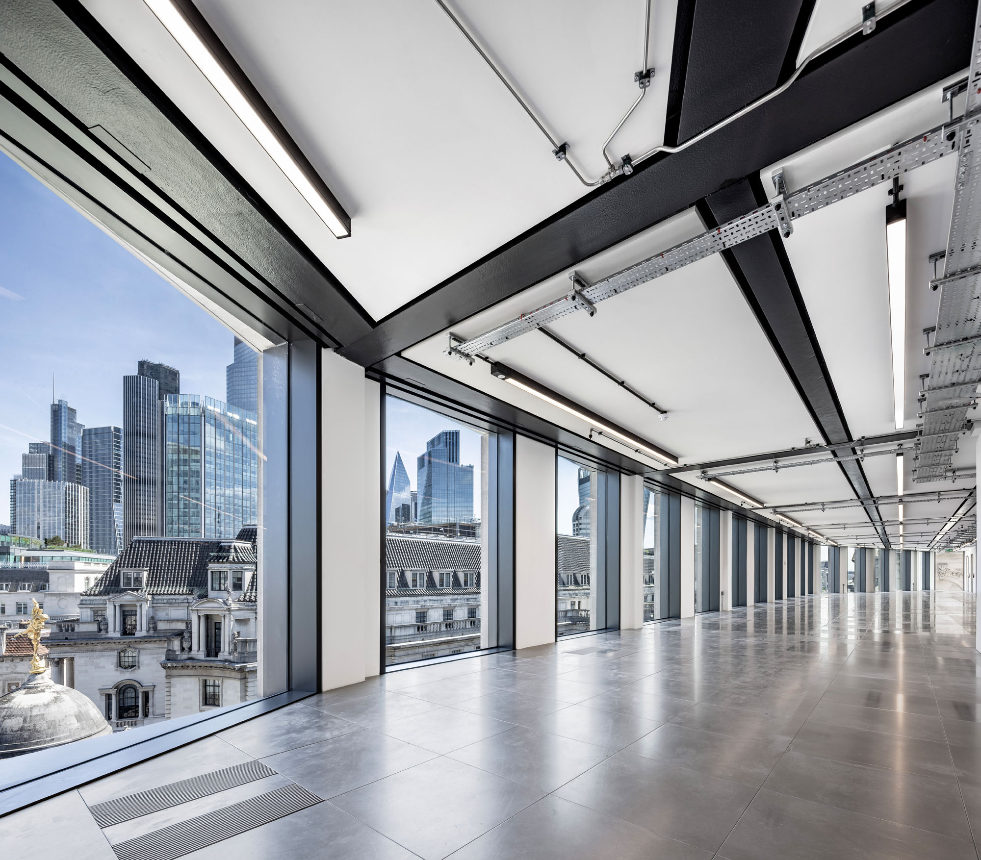 The ‘back to frame’ refurbishment works to the 1960s building at 7 Princes Street, opposite the Bank of England, will include a complete refurbishment and three-storey extension, including remodelling of the central core and complete replacement of the façade. The completed building will provide high quality, contemporary office space with rooftop terraces for private and communal use. The building is located next to The Ned, and with The Grocers Hall to the rear.