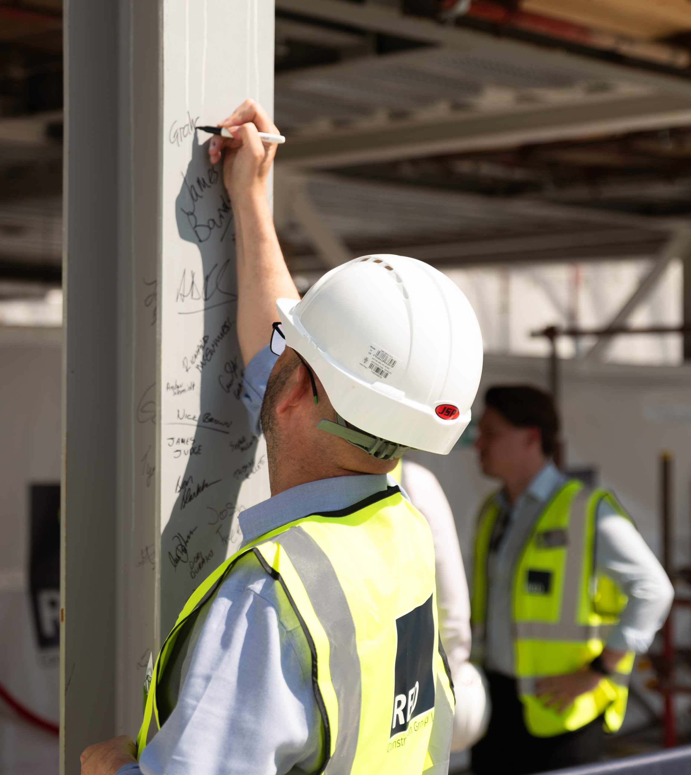 The ceremony included the traditional beam signing and concrete pour, where attendees were invited to leave their mark on the structure – a symbolic gesture to commemorate the collective contributions that have driven the project forward. Following the rooftop ceremony, we hosted a reception at a nearby venue for all attendees, offering drinks and canapés in a relaxed setting. It was a welcome opportunity for all involved to reflect on the achievement so far.
