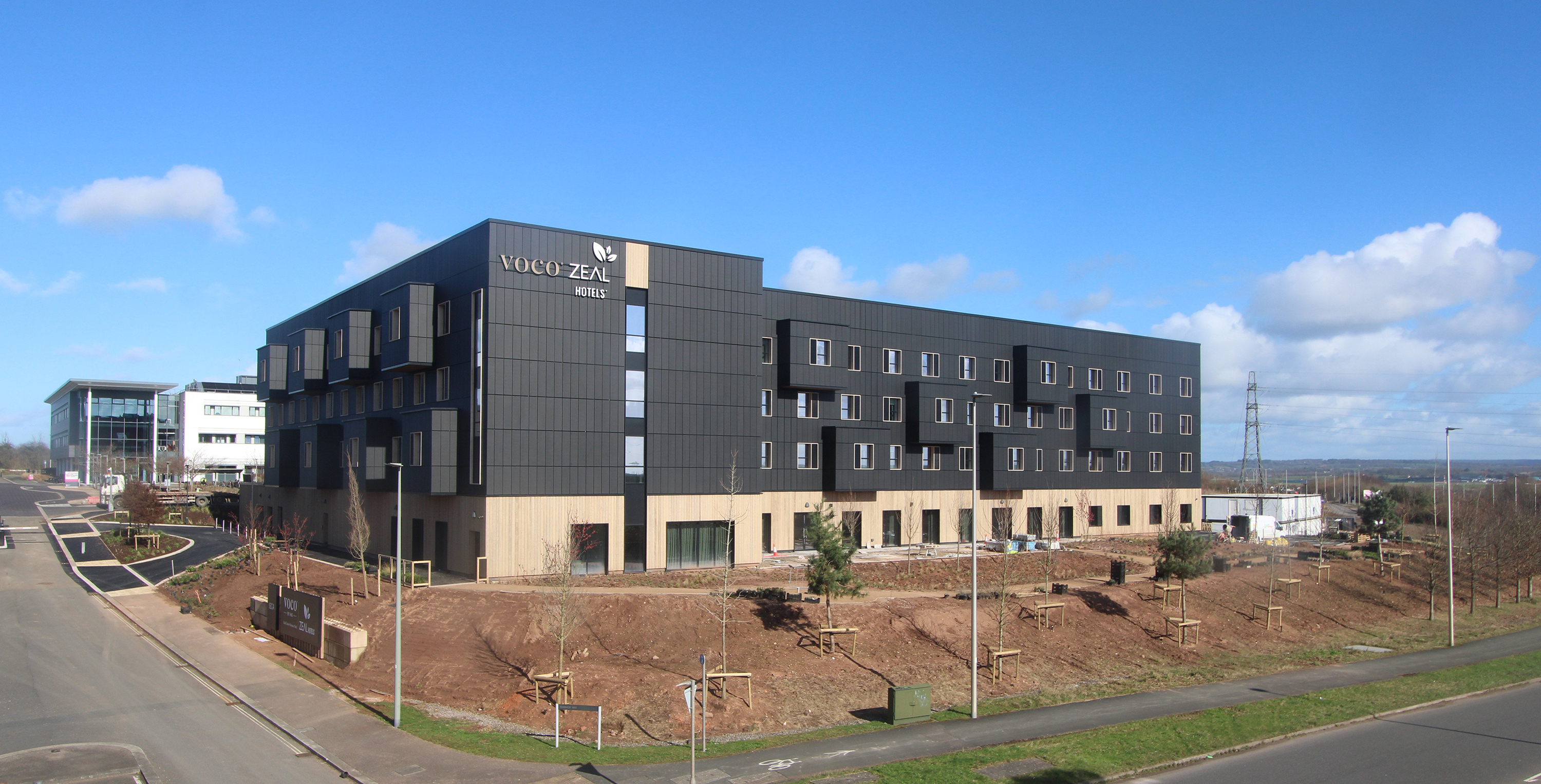 Delivered by our South West team, the 4-star Zeal Hotel is located within the Exeter Science Park and spans 5,718m². The Net Zero Carbon building includes 142 bedrooms, a restaurant and bar with private dining, conference facilities, a gym, and charging points for electric vehicles and electric bikes.